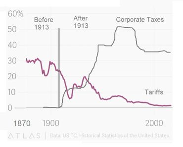 Before the Federal Reserve act and the 16th amendment in 1913, federal corporate taxes were zero and tariffs averaged about 20% giving domestic production a considerable advantage over foreign production of goods sold in the US. By 1975 corporate taxes had gone up dramatically to above 50% and tariffs have gone down to less than 5%. This punished domestic production and gave a huge advantage to foreign production. Now, even with domestic corporate tax rates reduced to 20%, foreign production still has the advantage.