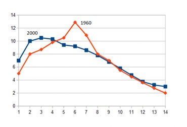 Here is more evidence from the Statistical Abstracts of the United States income tax data. I plotted the income distribution for years 1960 and 2000. In 1960 we see a bell curve showing a natural distribution. It shows a majority in the middle class with fewer and fewer as incomes increase and fewer and fewer as incomes decrease. But in the year 2000 we see an unnatural distribution, the middle class has completely disappeared and the peak income is the poverty level.